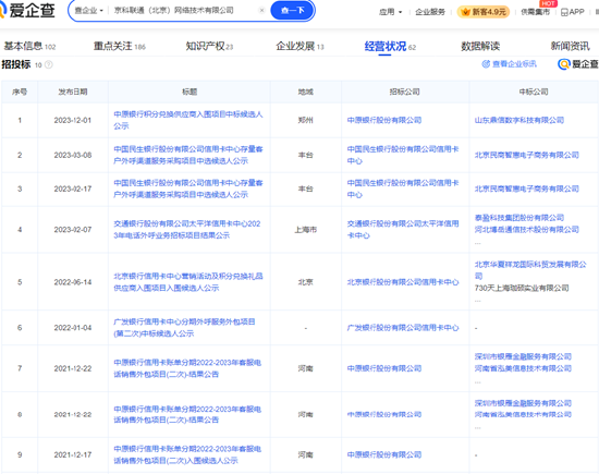 招投标信息显示,2019年11月至2023年12月,该公司入围了交通银行、民生银行、广发银行等多家银行信用卡中心的招标项目候选人名单。