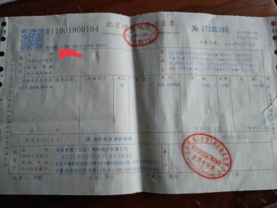 此外,张先生向我们提供了购买纪念品《筑梦中华》的发票。发票上记录的销售方并非民生银行,而是一家名为“京科联通(北京)网络技术有限公司”的企业。