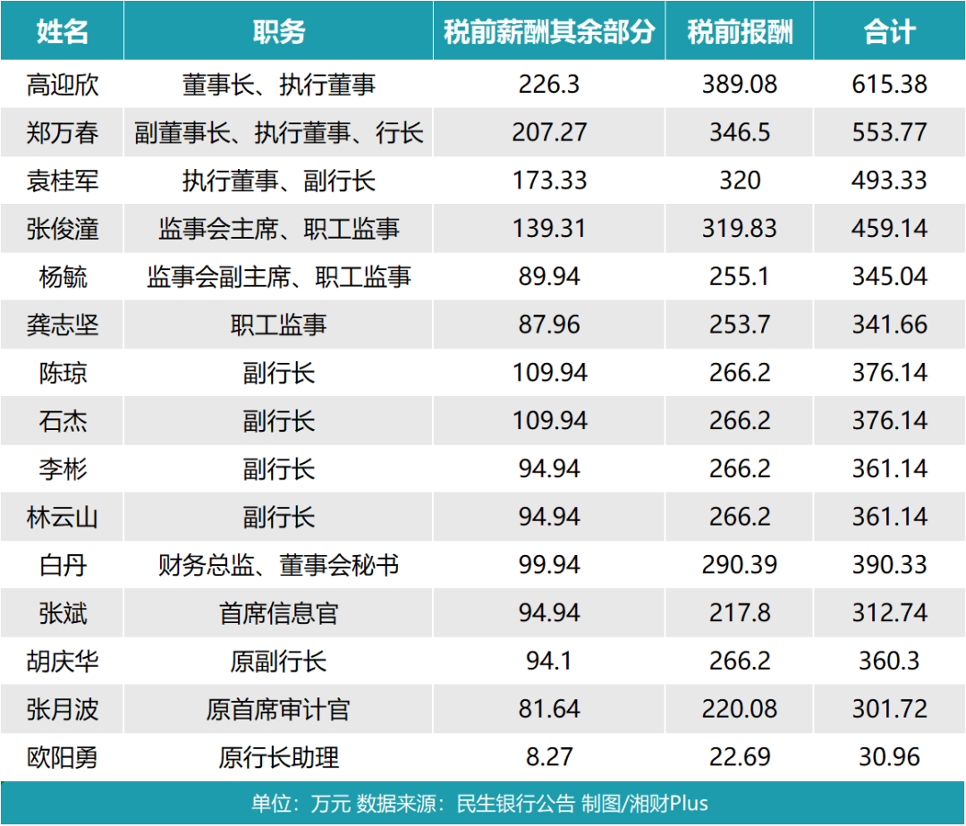 长久以来,民生银行高管的薪酬引发外界关注。湘财Plus统计了该行2022年度董监高人员的薪酬数据,上述退休的郑万春、袁桂军年薪合计超过1000万元。