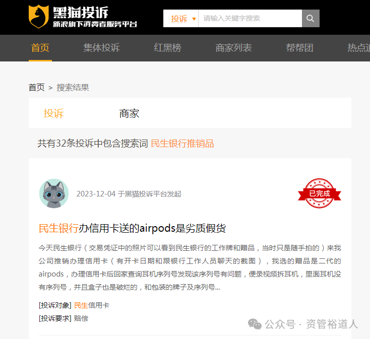 事实上,Y先生的经历并非个例,查看黑猫投诉平台发现,当输入关键字“民生银行推销品”,类似的投诉有32条之多。其中很多是Y先生这样被忽悠购买了纪念币、纪念册或者其他物品的。其中一位用户投诉显示: