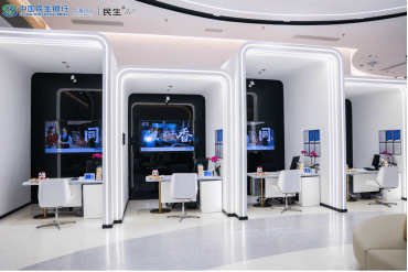 网点主要由艺术前厅和金融服务区组成。前厅以“光”为引,繁星闪耀的星空顶下,柱面宣传屏、智能互动大屏、智能迎宾机器人等给予客户极具交互感和时代感的沉浸式体验;前厅一侧的艺术橱窗内民生美术馆当期展览作品精致陈列,让客户遨游在美学的世界。走过前厅便步入金融服务区,整片区域以白色为主基调,设计简洁而又充满艺术张力,彰显着艺术的纯粹与金融的稳重。该区域包括民生+Art区、咨询引导区、理财服务区、现金服务区、对公服务区、智能服务区、远程专家体验仓、贵宾服务区以及典藏室,各功能区域划分明确,既保证了服务的专业性,又体现了空间的灵活性。