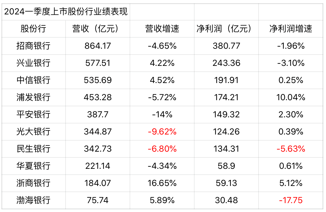 2024年一季度,民生银行营业收入342.73亿元,同比减少6.8%。同期净利润134.31亿元,同比减少5.63%,营收增速和净利润增速在10家上市股行中均排倒数第二。