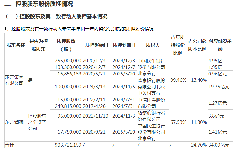 东方集团的控股股东为东方有限。据东方集团5月23日披露,东方有限及其全资子公司东方润澜质押股数为9.04亿股,占东方有限持股比例99.46%,占东方润澜持股比例67.93%,占公司总股本的24.70%,对应融资余额为34.09亿元。
