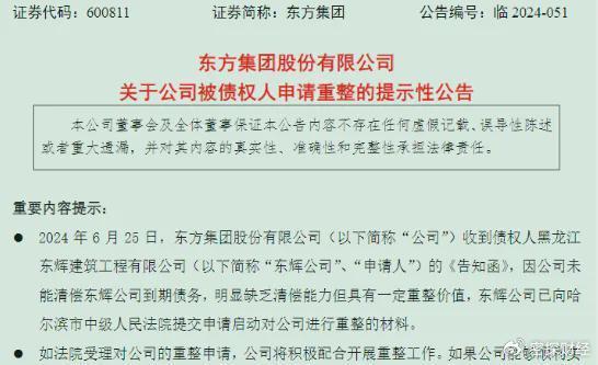 昨日,东方集团对外公告说,其被债权人黑龙江东辉建筑工程公司向哈尔滨中级法院申请破产重整。该债权人系东方集团旗下哈尔滨东方大厦改造及室内装潢工程施工承包方,未获兑现的工程款约75.2万元。