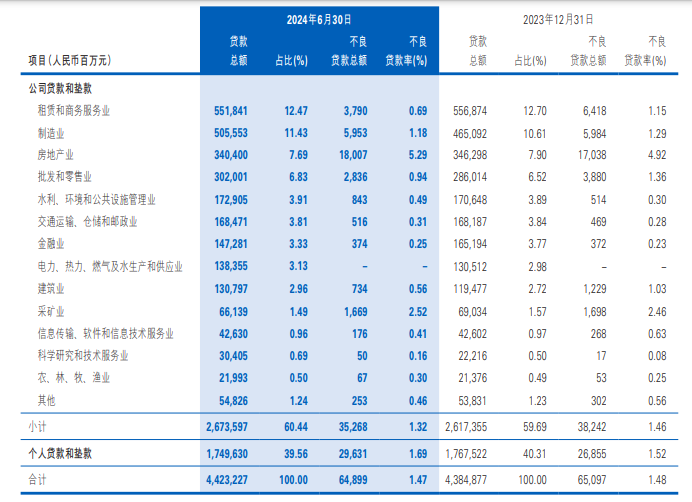 2)公司类贷款主要集中在租赁和商务服务业、制造业、房地产业,其中,租赁和商务服务业贷款总额5,518.41亿元,比2023年末减少50.33亿元;