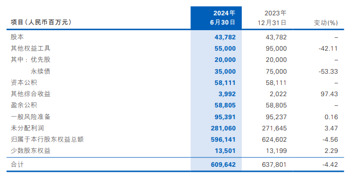 5)截至2024年6月末,民生银行股东权益总额6,096.42亿元,比2023年末减少281.59亿元,降幅4.42%,其中,归属于本行股东权益总额5,961.41亿元,比2023年末减少284.61亿元,降幅4.56%。