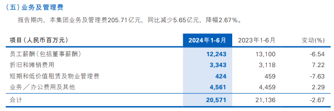 4)业务及管理费205.71亿元,同比减少5.65亿元,降幅2.67%。