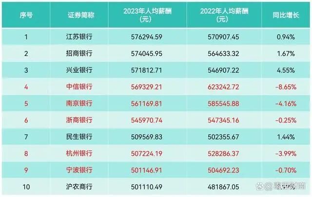 从8月份披露的上市银行半年报看,42家银行超250万人的平均薪酬下降5321元。薪酬方面,数据显示,2024年上半年,招商银行员工人均月薪酬超过5万元,兴业银行、浙商银行、南京银行、江苏银行等也在4.5万元以上。员工数量比较多的国有六大行,人均月薪酬不到3万元。