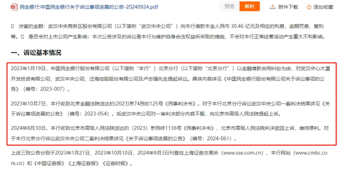 9月23日,民生银行发布一则关于诉讼事项进展的公告,披露了关于武汉中央商务区公司(泛海系)借款案件的最新情况。