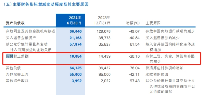 尤其是在主要财务指标变化表中,上半年民生银行的应付职工薪酬为100.84亿元,同比减少30.16%,公司给出的解释主要为应付工资、奖金、津贴和补贴的减少。