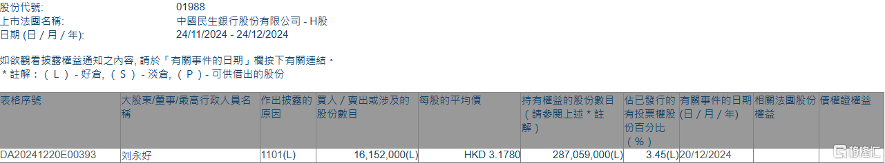 格隆汇12月24日丨根据联交所最新权益披露资料显示,2024年12月20日,民生银行(01988.HK)获非执行董事刘永好在场内以每股均价3.178港元增持1615.2万股,涉资约5133.11万港元。