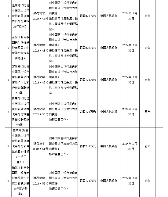 赵某斌(时任中国民生银行股份有限公司信用卡中心授信评审部副总经理)、许某彬(时任中国民生银行股份有限公司信用卡中心风险总监)、温某海(时任中国民生银行股份有限公司南昌分行洪城支行行长)、王某(时任中国民生银行股份有限公司北京国贸支行客户经理)、罗某顺(时任中国民生银行股份有限公司信用卡中心客户服务部副总经理)对中国民生银行股份有限公司违反信用信息采集、提供、查询及相关管理规定负有责任,分别被罚款10万元、10万元、0.4万元、0.8万元、7.1万元。