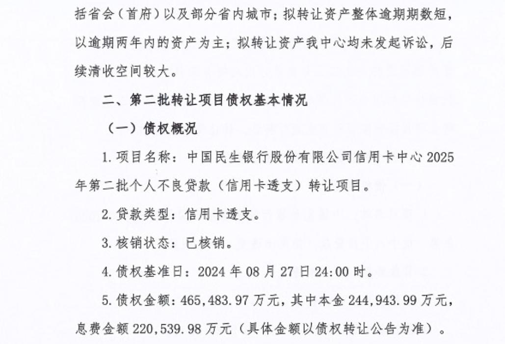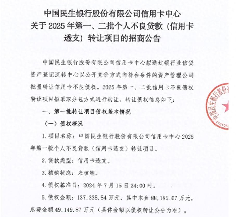 2月20日,民生银行信用卡中心发布公告称,该行拟以公开竞价方式批量转让信用卡不良债权,2025年第一批和第二批个人不良贷款(信用卡透支)债权金额共计60.28亿元,其中,本金33.31亿元,息费金额26.96亿元;共涉及不良债权88819笔,债务人85117户。