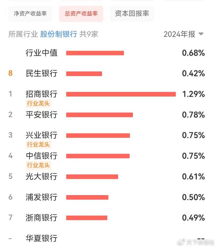 民生银行的资产收益率确实如公司所言是“下行”的,而且在已公布业绩的股份制银行中也是排名最低的。