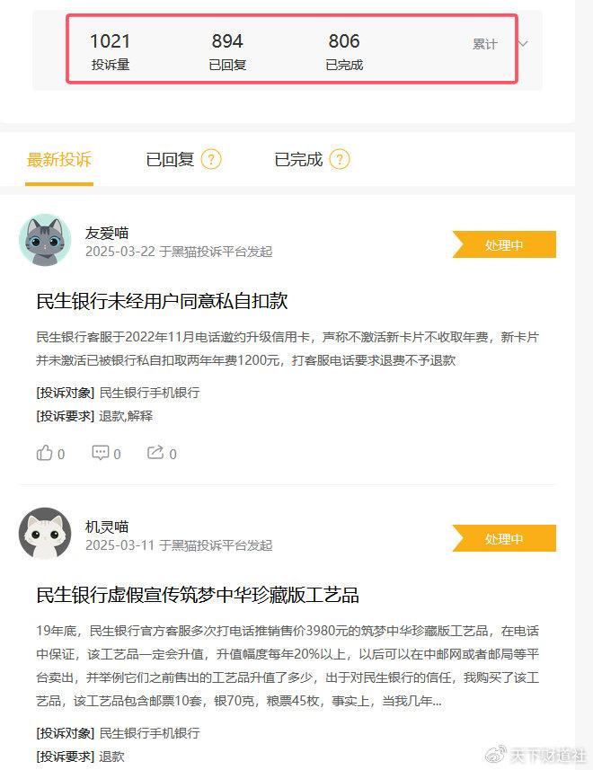 提升对客户的服务水平,也是民生银行应该重视的问题。截至2025年3月30日,黑猫投诉[下载黑猫投诉客户端]平台共计有1021条针对民生银行的投诉,内容主要涉及乱扣费、虚假宣传、暴力催收等问题。