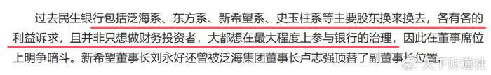 民生银行的主要股东经历了如泛海系、东方系、新希望系、史玉柱系等频繁更迭,各股东利益诉求各异,且有的不满足于作为财务投资者,更欲深度参与银行治理,导致董事席位争夺激烈。