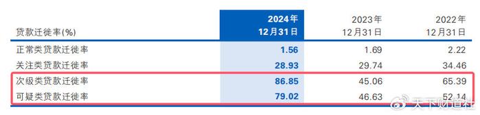 民生银行不良贷款率为1.47%,与2023年水平基本相当。但进一步分析发现,公司的次级贷款迁徙率、可疑类贷款迁徙率则分别由上一年的45%、46%增加至86%、79%。