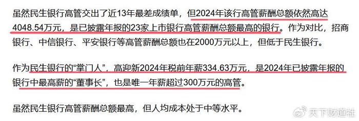 尽管存在上述种种问题,最新财报显示,民生银行董事长高迎欣2024年税前年薪约为335万元,为已披露年报的银行中薪酬最高的董事长,这引起了外界不少关注。