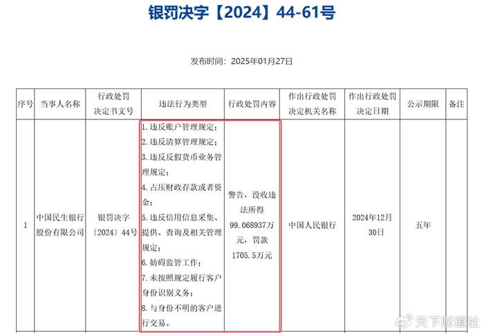 最新信息显示,合规问题依然应引起民生银行的高度重视。因八项违法行为,2025年1月,中国人民银行对民生银行罚款额高达1705万元。