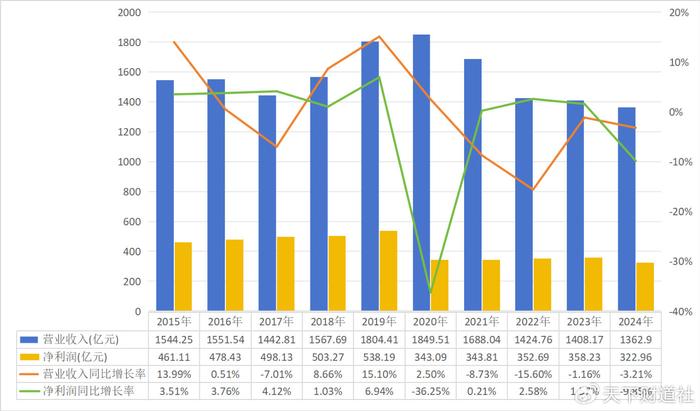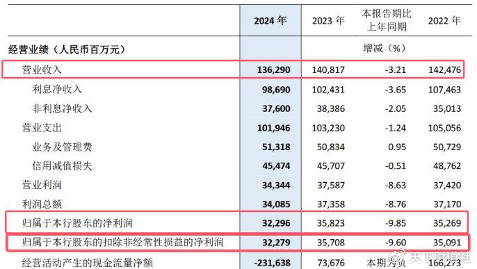 目前,公司业绩已跌入10年来的谷底水平。2015年,民生银行营收1544亿元,净利461亿元;到了2024年,这两个数值分别为1362亿元、323亿元。