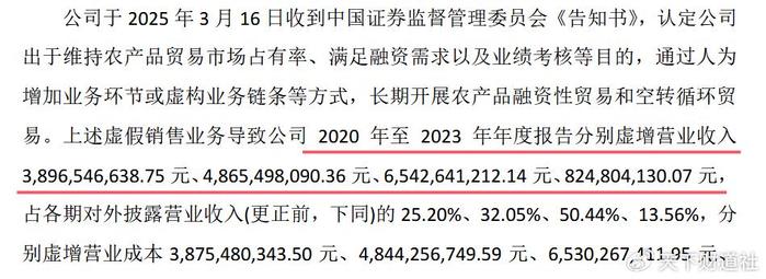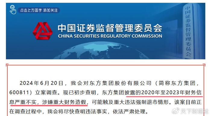 2025年3月16日晚间,东方集团发布公告称其收到证监会《行政处罚事先告知书》。2020年至2023年,东方集团虚增收入超过161亿元,连续四年年报存在虚假记载。