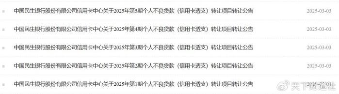 2025年3月3日,银行业信贷资产登记流转中心(简称“银登中心”)上架了2025年民生银行首批个人不良贷款转让项目,5个资产包均涉及信用卡透支,合计未偿本息总额超过6亿元。