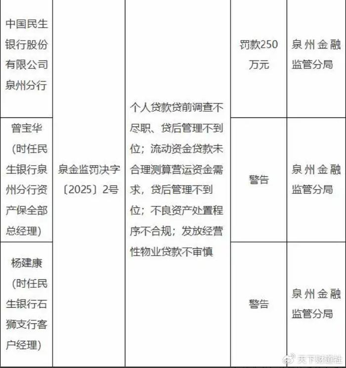 2025年2月,民生银行泉州分行因贷前调查不尽职、贷后管理不到位等多项违规行为被罚款250万元。