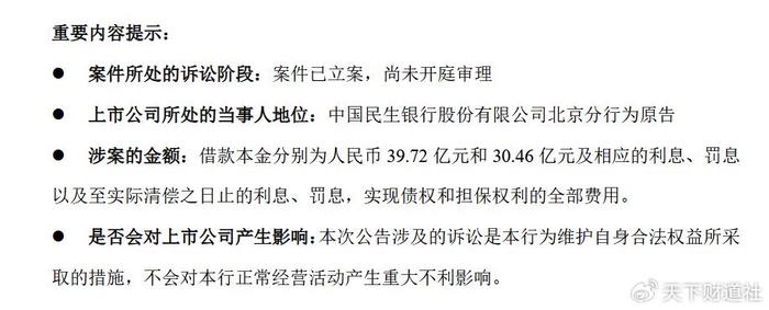例如,2023年1月民生银行起诉泛海系公司要求偿还超70亿元贷款,但执行结果仍不明朗。2024年5月,民生银行再度提起诉讼。