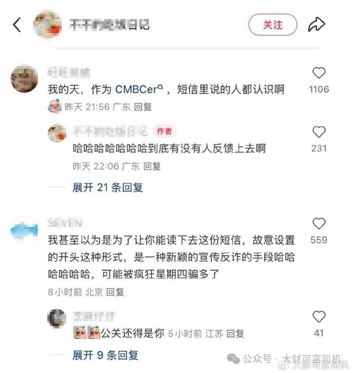 网友看完这场魔幻现实大片后,惊呼“我的天”!表示,吃瓜吃到熟人身上。还有网友表示:“甚至以为是为了让你读下去这份短信,故意设置的开头这种形式,是一种新颖的宣传反诈的手段!”
