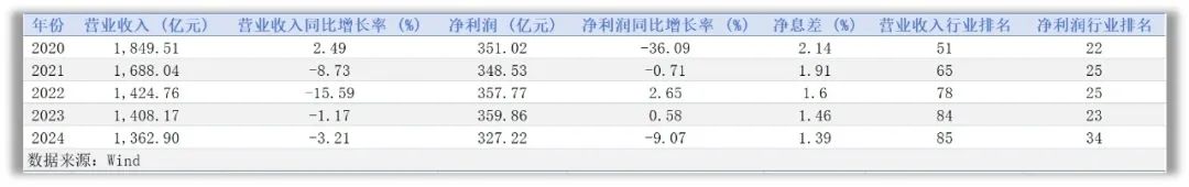 Wind数据显示,这家银行的营业收入从2020年的1849.51亿元逐年下降至2024年的1362.90亿元,累计降幅达26.33%。净利润则在2020年达到351.02亿元后,经历了先降后升再降的过程,最终在2024年降至327.22亿元,累计降幅为6.78%。