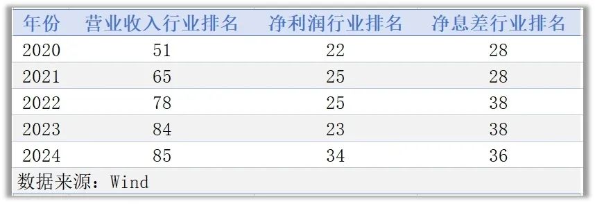 数据显示,民生银行的营业收入排名从2020年的第51名逐年下降至2024年的第85名,累计下降34个名次。净利润排名从2020年的第22名下降至2024年的第34名,累计下降12个名次。净息差排名从2020年的第28名下降至2024年的第36名,累计下降8个名次。