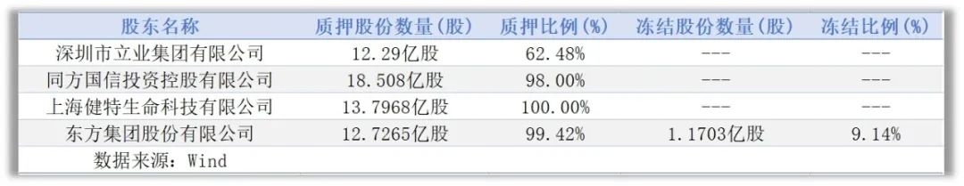 值得注意的是,“欠款大户”东方集团持有12.8亿股A股,占总股本的2.92%,其中12.73亿股处于质押状态,质押比例为99.4166%。此外,还有11.7亿股处于冻结状态,占其持股的9.142%。