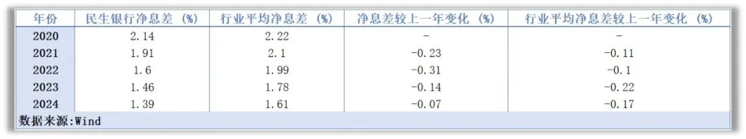 不仅如此,民生银行的净息差也连年下降,并且下降幅度超过行业平均水平。这家银行的净息差从2020年的2.14%逐年下降至2024年的1.39%,累计下滑了0.75个百分点。行业平均净息差,同期从2.22%下降至1.61%,累计下滑了0.61个百分点。