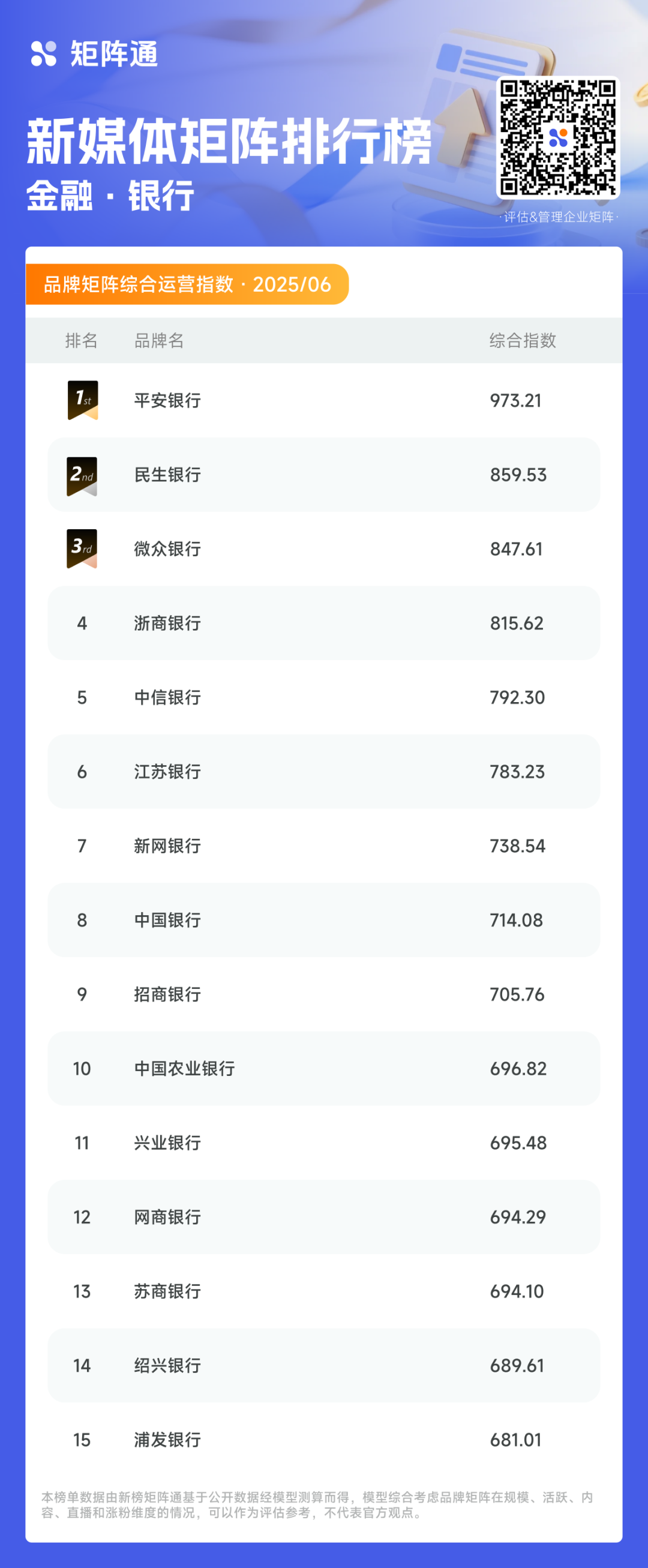 平安银行、民生银行、微众银行位列前三!金融银行新媒体矩阵6月榜发布
