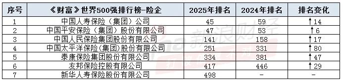 此次入围2025年《财富》世界500强排行榜的国内保险公司共有7家,与上年相比,总量增加1家。