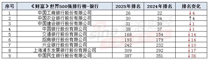 国内银行方面,今年共有9家银行登上2025年《财富》世界500强排行榜,包括5家国有大行及4家股份制银行,数量与上年相比未有变化。