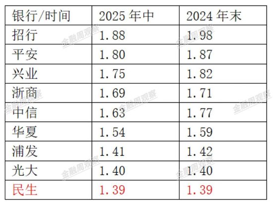 上半年民生银行的净息差为1.39%,同比是提升了1BP的,环比去年末持平,这在同业里可以说是逆势般的存在。
