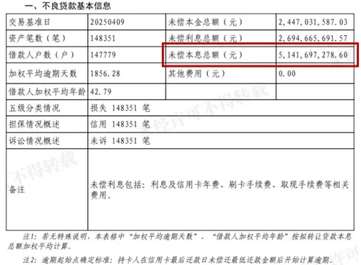 此次在银登中心挂牌转让的51.42亿元信用卡不良资产包,更是凸显了该业务的风险积聚——加权平均逾期天数1856.28天(约5年),借款人加权平均年龄42.79岁,对应14.78万个家庭的债务困境,折射出 民生银行 在客户筛选、风险管控上的明显漏洞。