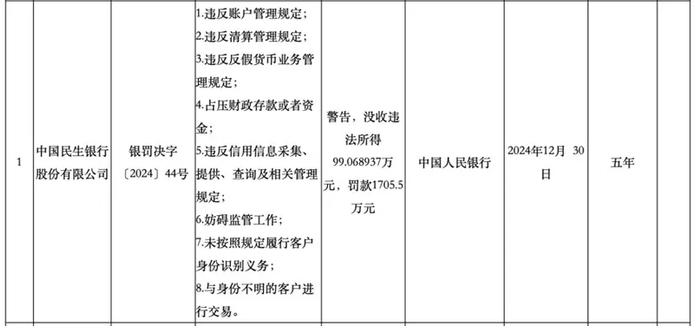 梳理公开信息不难发现, 民生银行 的合规问题早已不是“偶发事故”,而是持续多年的“沉疴顽疾”。2020年至2024年,该行被罚金额分别达到1.11亿元、1.37亿元、0.46亿元、2.2亿元、0.19亿元,近六年累计罚款超6亿元,成为股份制银行中名副其实的“罚单大户”。