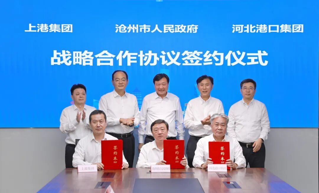 9月19日,河北港口集团党委书记、董事长曹子玉同沧州市委书记张才,河北省国资委二级巡视员魏晓杰专程赴上海拜访上海国际港务(集团)股份有限公司(下称“上港集团”)党委副书记、总裁宋晓东,三方共同签署战略合作框架协议。河北省国资委二级巡视员、规划发展处处长王大玮参加。