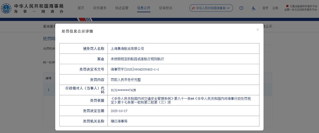 齐鲁晚报·齐鲁壹点记者于中国海事局监管信息公开栏获悉,10月17日,上港集团(600018.SH)旗下的上海集海航运有限公司(下称“上海集海航运”)收镇江海事局罚单,处罚决定书文号:海事罚字
