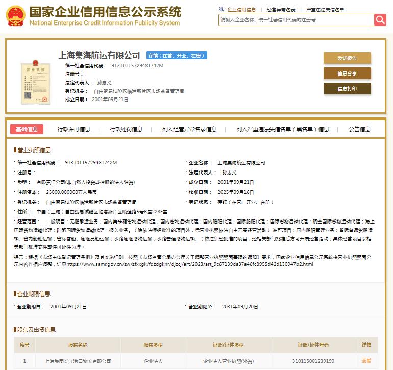 国家企业信用信息公示系统显示,上海集海航运有限公司成立于2001年,注册资本25000万元人民币,法定代表人为孙忠义,其由上港集团(600018.SH)全资子公司——上港集团长江港口物流有限公司全资持股。