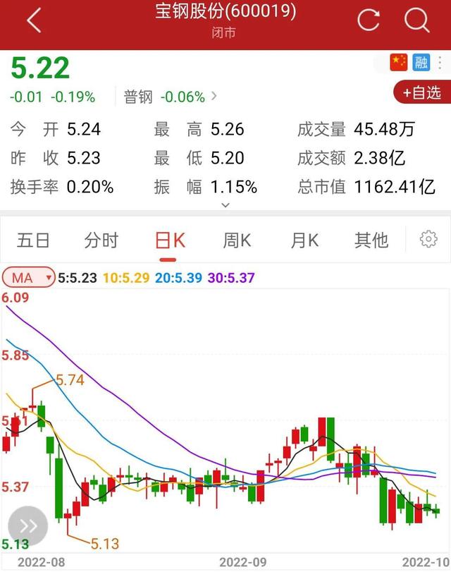 宝钢股份(600019)从9月16号的5.62元跌到当前最新价5.22元,跌了7%。从12.07元跌到5.22元,除权除息后跌了54.3%左右,腰斩过半了。