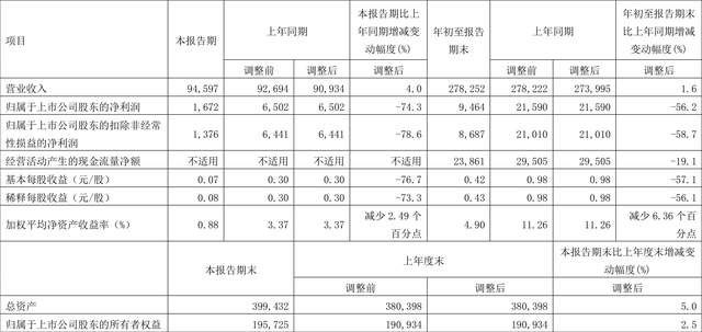 根据三季报,公司第三季度实现营业总收入949.41亿元,同比增长4.41%,环比下降3.12%;归母净利润16.72亿元,同比下降74.28%,环比下降58.80%;扣非净利润13.76亿元,同比下降78.63%,环比下降63.96%。