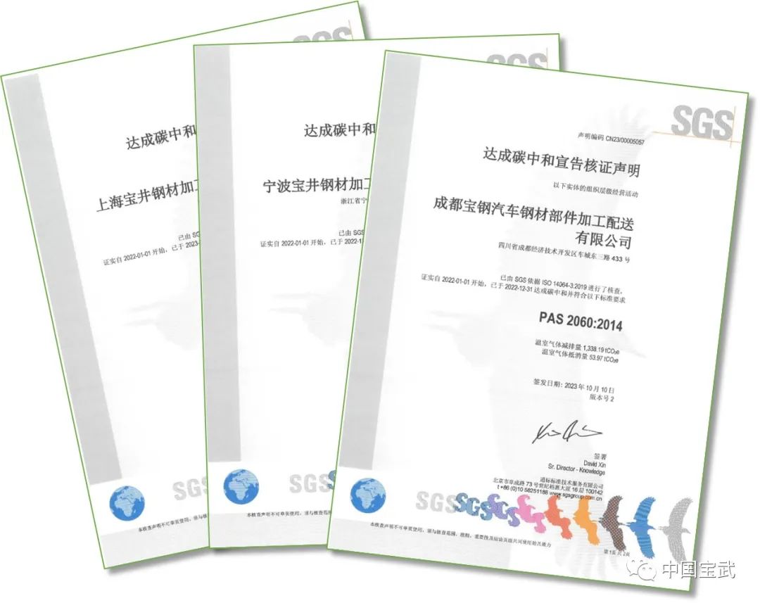 近日,宝钢股份成都宝钢、上海宝井和宁波宝井等三家钢材加工配送中心,,成功取得国际权威认证机构颁发的2022年度“达成碳中和宣告核证声明”证书,标志着宝钢股份成为全国首家在钢材加工中心领域实现“运营碳中和”的钢铁企业。