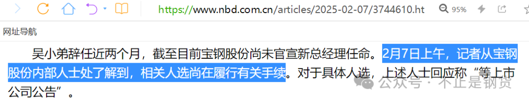 吴小弟辞任近两个月,截至目前宝钢股份尚未官宣新总经理任命。2月7日上午,记者从宝钢股份内部人士处了解到,相关人选尚在履行有关手续。对于具体人选,上述人士回应称“等上市公司公告”。