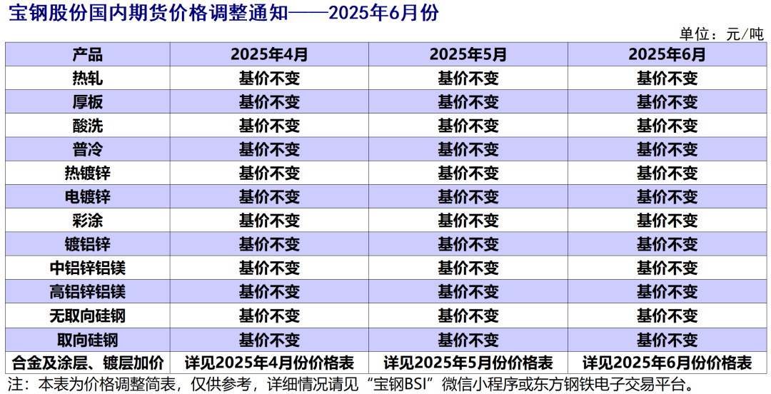 经研究决定,宝钢股份板材内销价格2025年6月份在2025年5月份基础上调整公告如下(以下除特殊注明外,均为不含税):