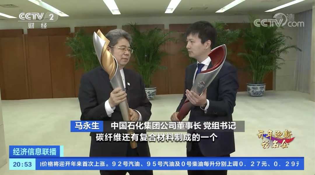中国石化集团公司董事长党组书记马永生:这个就是利用我们中石化自己的技术,碳纤维还有复合材料制成的,应该说用这种材料制作奥运火炬,在国际上是首例。它很轻,大概是600克左右,它的燃料也是我们中石化的产品,氢能。