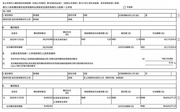 中国石化11月3日报表披露,11月3日,公司于联交所回购2023.4万股,每股作价介于3.18至3.25港元,涉资约6511.5万港元。年内至今,自普通决议案通过以来共回购1.9亿股H股,占已发行股份0.16%。同日,于上交所回购945万股A股,每股作价介乎4.11至4.21元人民币,涉资约3963.46万元人民币。