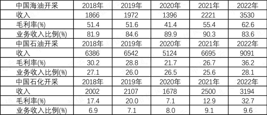 从上面表格也得知(不考虑业务抵消),石油开采业务贡献的收入,中国海油的比例最高,而中国石化最低:2022年中国海油、中国石油、中国石化勘探及开采业务收入占比分别为83.6%、28.1%、9.6%。